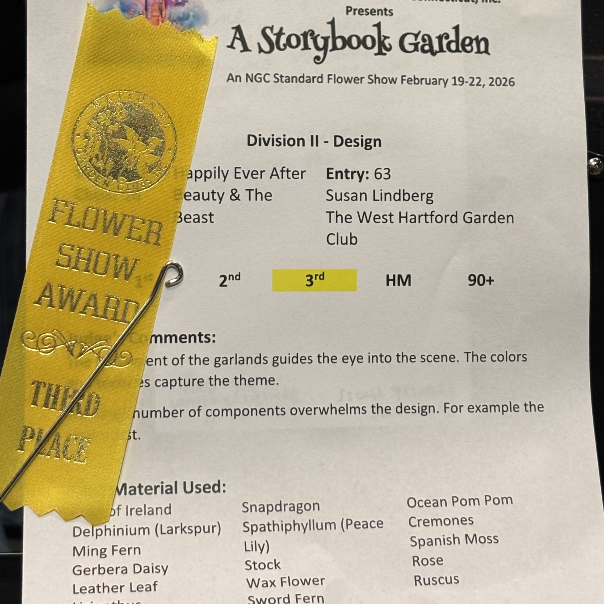 Under the leadership of President Susan Lindberg, The West Hartford Garden Club team (Sheila Daley, Suzanne Miller, Sharon Mulvey, Sarah Townswick, and Roxanne Witmer-DeWitt) presented an exceptional floral floor design entitled “Happy Endings – Beauty and the Beast” at the 2026 Connecticut Flower and Garden Show. The exhibit received Third Prize, the Northeast Expos Award, and was also honored with the Barbara Bruce Peoples’ Choice Award, recognizing it as one of the most admired displays of the event.